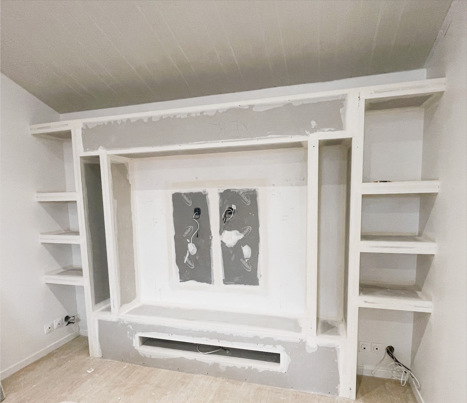 Étagères et bibliothèques en placo, sur-mesure et intégrées aux murs.